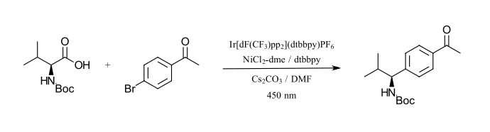 The first reaction that we want to highlight is an Iridium/nickel catalyzed carbon-carbon bond formation as described by MacMillan and coworkers (Ref 14).  This approach uses a commercially available iridium catalyst (Ir[dF(CF3)ppy]2(dtbbpy)PF6 (structure in Figure 2) with a CFL bulb.  The photoredox cycle activates a nickel catalyzed organometallic cycle for the coupling of α-carboxyl sp3-carbons with aryl halides.  The nickel catalyst is formed in situ between NiCl2 with dtbbpy as a ligand.  The reaction requires a base (Cs2CO3) and sparging with nitrogen to remove oxygen.   The reaction demonstrated coupling for a wide range of carboxylic acids with aryl bromides, iodides and select chlorides.  The test reaction we have selected is the coupling of N-Boc-Valine and 4-bromoacetophenone which we have adapted from the reported procedure to use 450 nm LED instead of the CFL (Figure 8).