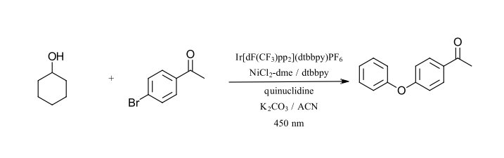 The second reaction that we have selected is also by MacMillan and coworkers using Ir/Ni catalysis, however this time for C-O bond formation (Ref 21).  This reaction also uses (Ir[dF(CF3)ppy]2(dtbbpy)PF6, NiCl2 and dtbbpy as a ligand.  This reaction requires quinuclidine as an electron donor/acceptor and an additional base.  The reaction uses primary and secondary alcohol for C-O bond formation with aryl bromides.  The reaction requires a base (K2CO3) and sparging with nitrogen to remove oxygen.   Nickel itself is unable to perform C-O couplings without the use of high temperatures due to the stability of nickel-alkoxide complexes.  The photoredox cycle using a 450 nm LED and the iridium catalyst can activate this cycle at room temperature for a wide variety of alcohols and aryl bromides.  The test reaction that we have selected is the coupling of cyclohexanol and 4-bromoacetophenone with 450 nm (Figure 9).