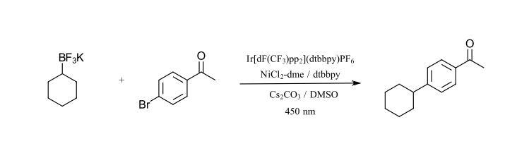 The third reaction that we want to highlight is also a C-C bond formation, however this time using an alkyl BF3K reagent as the coupling partner. Molander and coworkers have performed a substantial amount of work using BF3K reagents for photoredox catalyzed transformations. The reaction we are focusing on is the Iridium/nickel catalyzed cross coupling of aryl bromides with secondary alkyl BF3K reagents (Ref 22). BF3K reagents are easy to handle, bench stable solid reagents useful for many cross-coupling reactions. This reaction works extremely well for a wide range of alkyl-BF3K with aryl bromides and can very quickly be used to generate a large series of analogues. The reaction requires a base (Cs2CO3) and sparging with nitrogen to remove oxygen. The test reaction we have selected uses cyclohexyl-BF3K and 4-bromoacetophenone (Figure 10). We have modified the reaction condition to use Ir[dF(CF3)ppy]2(dtbbpy)PF6 instead of Ir[dF(CF3)ppy]2(bpy)PF6 (slightly different ligand), lowered the catalyst loading and use 450 nm LEDs instead of CFL.