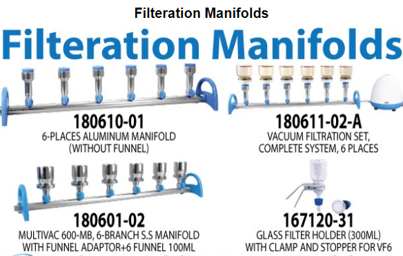 The manifold typically includes 3 or 6 funnels, which can filled with 47mm filter paper membranes. The filter media can be selected based on the size and type of particulates or molecules that need to be removed from the liquid.