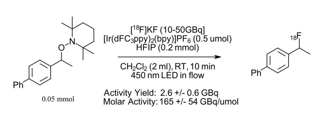 In the end, the authors successfully developed “the first redox-neutral, light-mediated nucleophilic fluorination of alkoxyamines, and demonstrate suitability for 18F-labeling and applications in PET imaging.” The automated process takes advantage of two commercial instruments with easy operation and should be broadly applicable to other flow photoredox processes. Great work!