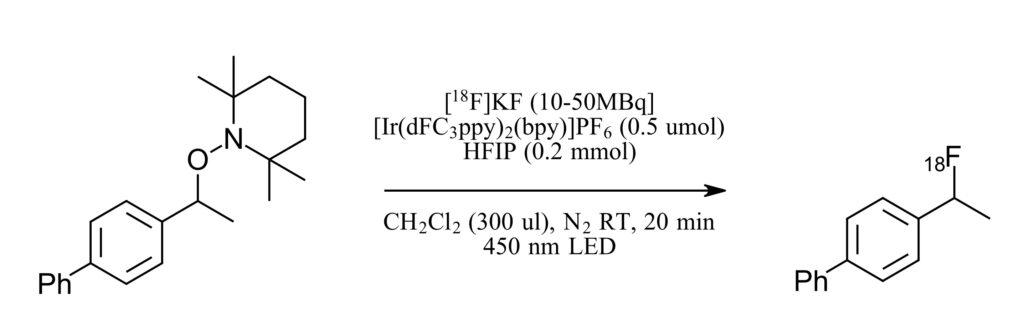 When we see an EvoluChem PhotoRedOx Box™ used in creative ways, we feel obliged to share it as loudly as possible. Recently, we wrote about photocatalytic methods for Hot labels using HAT for deuterium and tritium labeling that used the PhotoRedox Box TC™. This month, we have this amazing work from Veronique Gouverneur and coworkers in JACS entitled “Photoredox Nucleophilic (Radio)fluorination of Alkoxyamines” (Ref 1) developing a novel photoredox induced fluorination for radiolabeling a wide range of pharmaceutically relevant small molecules. The optimized reaction was then applied to a radiosynthesizer which incorporated a PhotoRedOx Box Flow Reactor™ and blue LED as part of a flow process ultimately affording an automated radiosynthetic platform with fast access to 18F labeled aliphatic fluorides. An amazing work—but we’re getting ahead of ourselves.