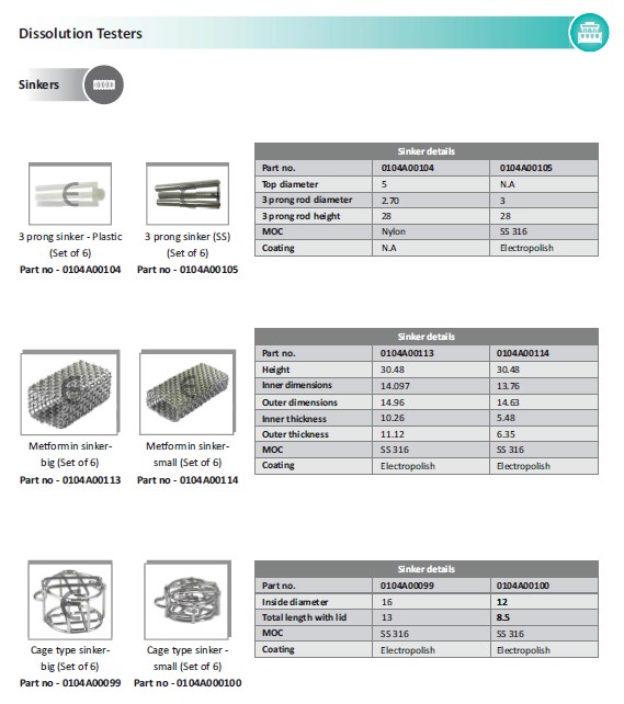 Longitudinal sinkers contact the dosage forms on the long axis. Lateral sinkers either wrap around or contact capsule dosage forms in the middle, such as the line where the top and bottom halves of a capsule shell come together. Screen enclosures are of thw type : either a wire cage, which holds the entire capsule, or a circular piece of wire screen placed on top of the capsule. Internal weights consist of two steel ball bearings, one inserted into each end of the capsule.